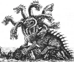 Hydra Wyrms (Pieracanthus polycaput) are aquatic lizards with nine necks and heads. They tend to be solitary creatures, living in freshwater lakes and rivers, tending to trawl the bottoms of these waters for food. They have been known to come onto land for a time and even to attack large creatures such as cows and metahumans for food, but this is a rare occurrence. Usually, Hydra Wyrms will not attack any creatures unless provoked, frightened or near starvation.